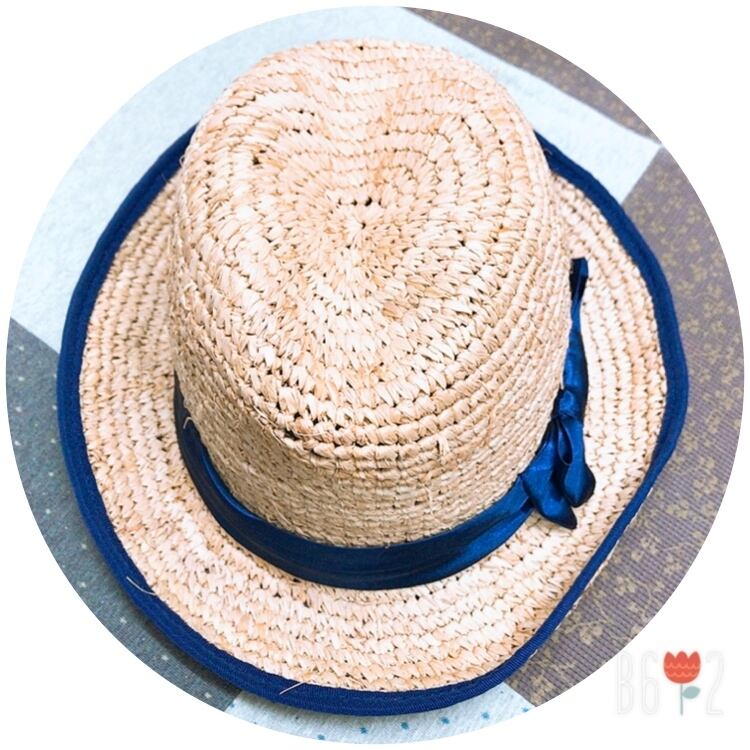 ブルーのリボンでトリミングしており、どこか、レトロな雰囲気のお帽子です。